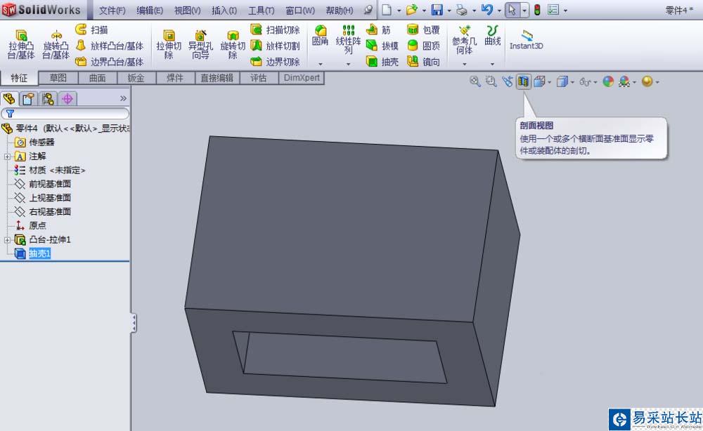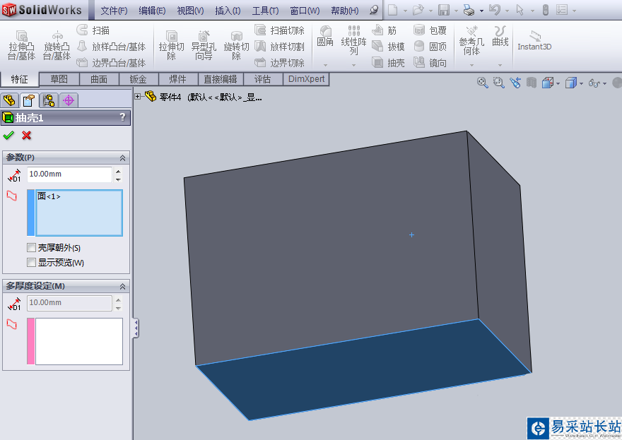 2、在特征工具欄中選擇抽殼命令,選擇矩形體的一個面抽殼。