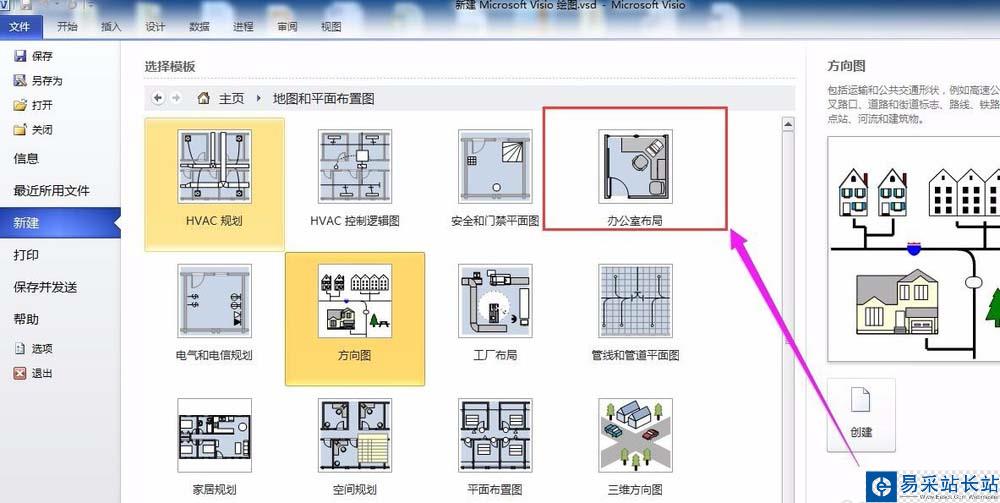 1、新建一個(gè)VISIO文檔,在模板中選擇“地圖和平面布局圖”,之后再選擇“辦公室布局”。