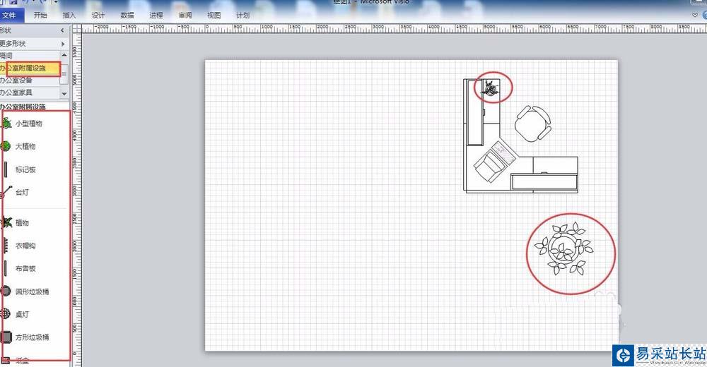 4、如果辦公室有植物、臺燈、垃圾桶等附屬設(shè)施,也可以添加至繪圖區(qū)域。