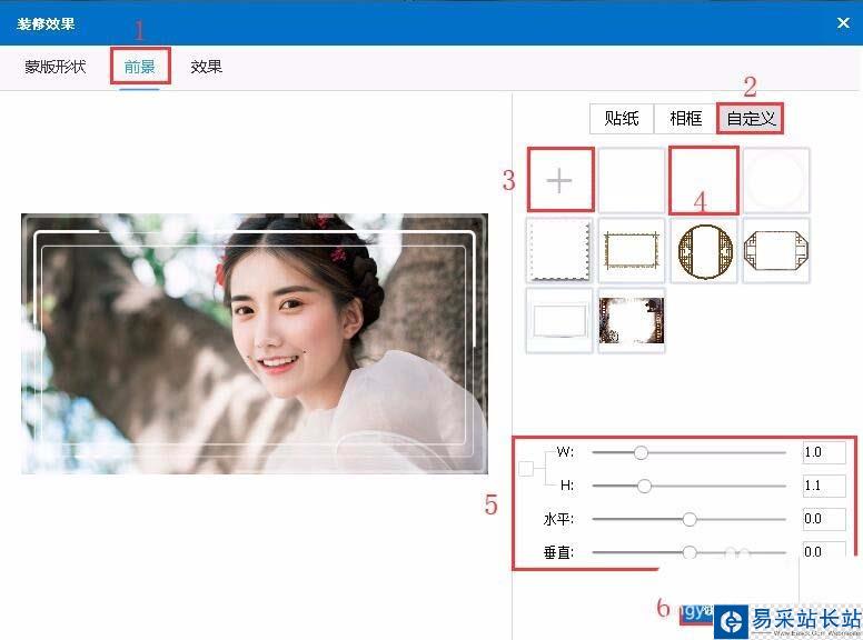 “前景”->自定義->點(diǎn)擊“+”按鈕在新窗口中添加相框->選擇相框->調(diào)整相框?qū)捀?、水平垂?>“確定”