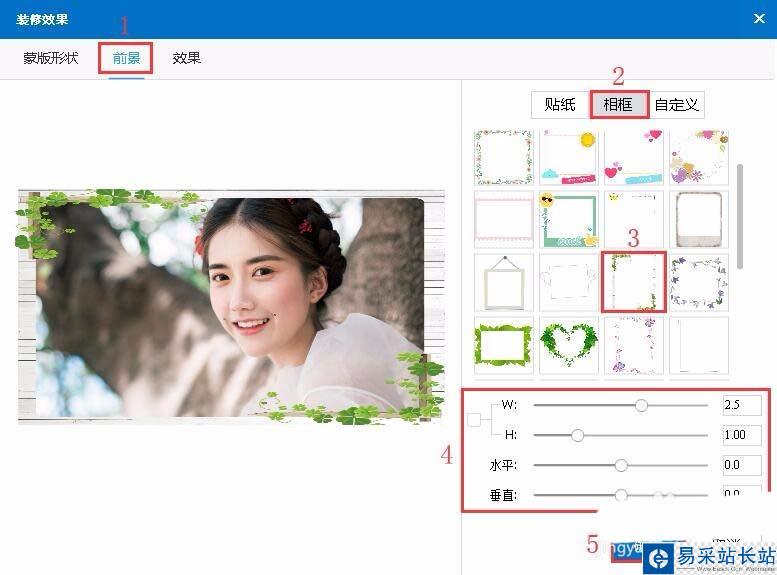 “前景”->“相框”->選擇一種相框效果->調(diào)整相框的寬高、水平/垂直->“確定”