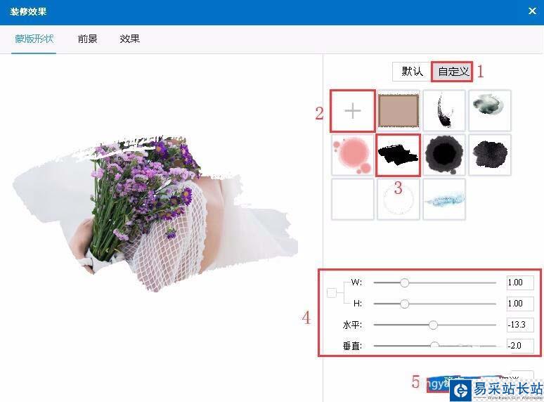 自定義->點(diǎn)擊“+”按鈕在新窗口中添加蒙版形狀->選擇蒙版->調(diào)整蒙版寬高、水平垂直->確定