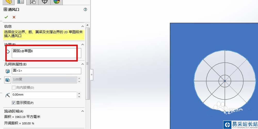 4、首先需要選擇的是通風(fēng)口的邊界.這里選擇的是草圖中的最外層的一個(gè)圓.