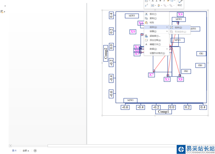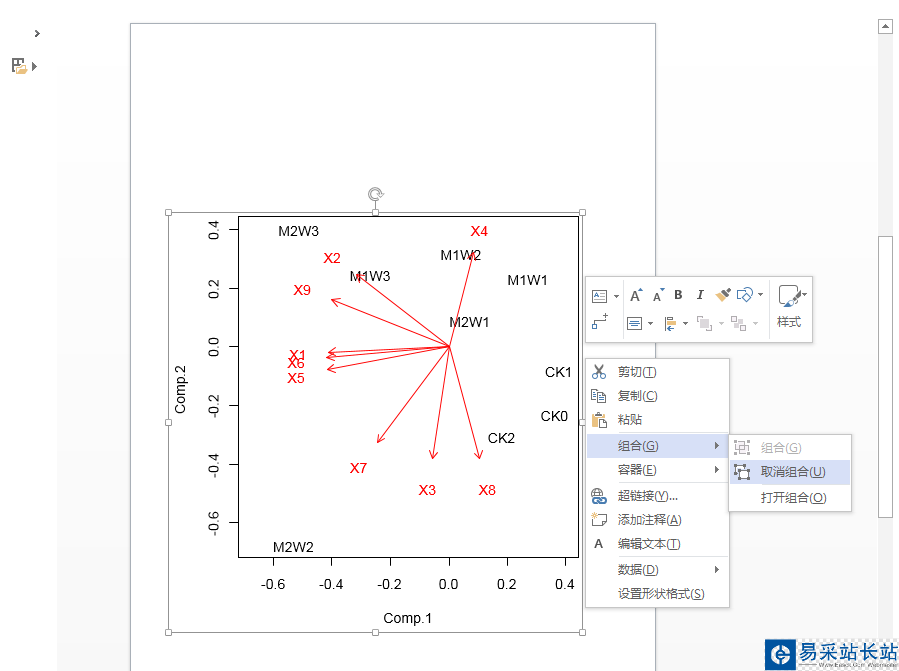 4、取消組合。鼠標(biāo)左鍵單擊導(dǎo)入的圖片,釋放鼠標(biāo)左鍵后右擊,在彈出的快捷菜單中找到“組合”,鼠標(biāo)移動(dòng)到該快捷菜單,在其二級(jí)菜單中選擇“取消組合”。