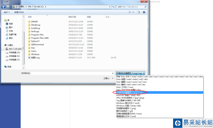 3、打開(kāi)需要修改的圖片。執(zhí)行“文件”-“打開(kāi)”,在“打開(kāi)”對(duì)話框右下角選擇需要編輯的矢量圖相應(yīng)的文件格式。找到需要修改的圖片,這里事先準(zhǔn)備了一張svg格式的圖片,如圖所示。