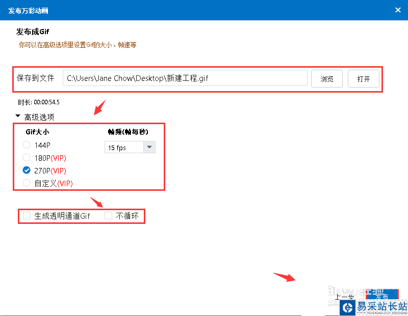 3、選擇需要保存到的文件夾, 完善GIF信息(GIF大小,幀頻等), 選擇是否生成透明通道GIF和循環(huán)GIF。 最后點(diǎn)擊“發(fā)布”。