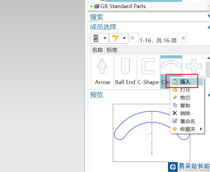 5、打開公制文件夾,選取想要的2D截面圖。鼠標點右鍵選插入(直接雙擊相應圖 標也行), 彈出的對話就是讓你選擇放置標準件在哪個面上,哪個點上。調出后的圖形,通過雙擊可進入草繪模式,這里可以對該截面圖進行修改。從面得到準確的2D截面圖。