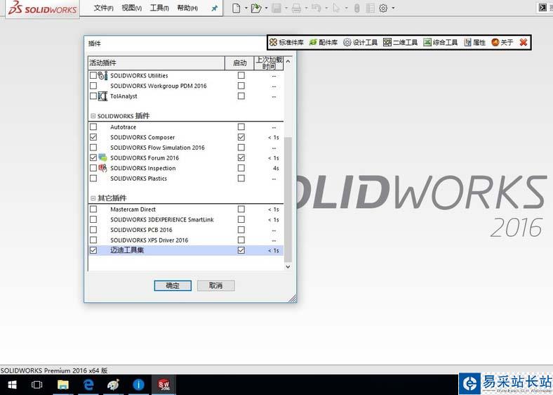7、待SolidWorks完全打開后,打開插件,確認“邁迪工具集”已選中。至此插件安裝完成,可以開始使用。