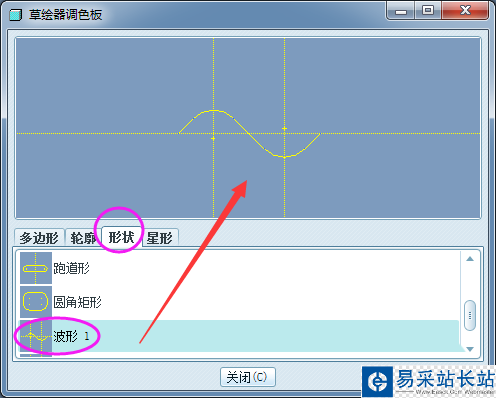 3、系統彈出“草繪器調色板”的屬性窗口如下所示,點擊“形狀”,點擊選擇“波形1”,最上面的窗口會有預覽效果,對“波形1”雙擊鼠標左鍵或者拖動到草繪界面,隨意找個位置單擊鼠標左鍵將其放置。