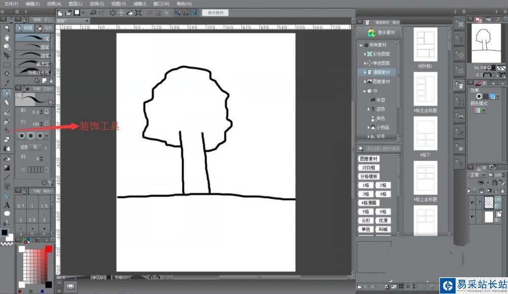2、繪畫完成,我們接下來可以向畫布上添加特效效果,點擊優動漫左邊工具欄中的【裝飾】按鈕。