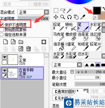 2、把五官手腳圖層勾上保護不透明度,用黑色在五官手腳圖層上涂畫,這時只能畫到有顏色的部分,把線畫成了黑色。最后把頭和五官手腳圖層合并成一個線稿層。