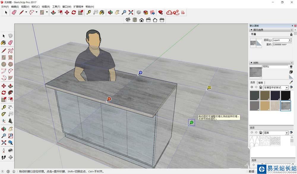 5、點擊縮略圖,鼠標會變成油漆桶,點擊臺面,即材質貼到了臺面上,但是比例尺寸不合適,可以調整。