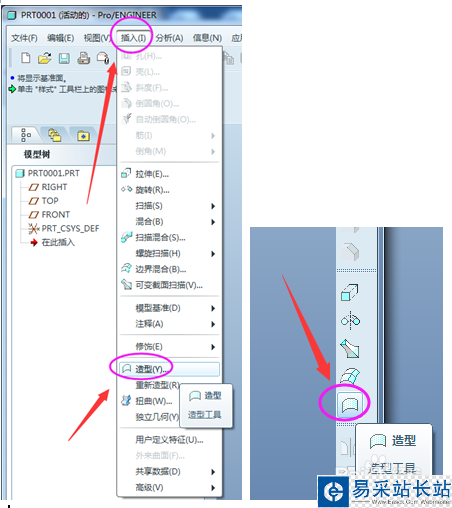 2、進入造型模塊,有兩種方法:一是依次點擊“插入”-“造型”;二是點擊工具欄的“造型”按鈕。如下圖所示。