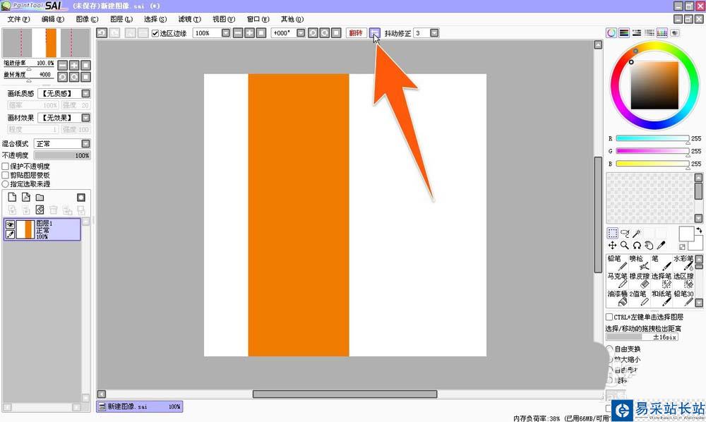 3、當在SAI中需要水平翻轉畫布時,那么在上方工具欄里面,有一個帶左右箭頭狀的圖標,點擊它就可以進行畫布的水平翻轉。