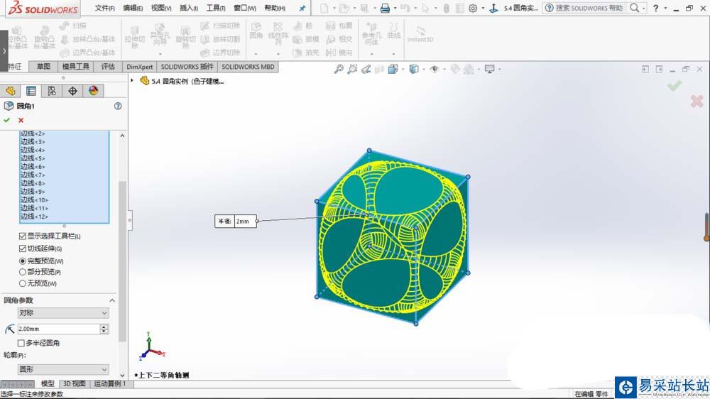 3、采用圓角特征命令,選擇所有邊線,點擊確定。
