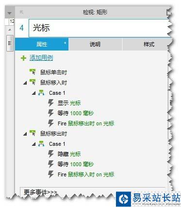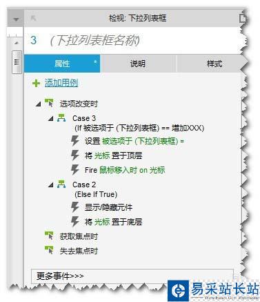 4、設置"光標"循環觸發方式。比如,當下拉框選項,選擇”增加XXX"時,觸發"光標"的“鼠標移入時”狀態(必要的時候,可以置“光標”頂層),即可看到“光標”在那一閃一閃,等待輸入的狀況了,下圖為“下拉框”選擇時的動作參考