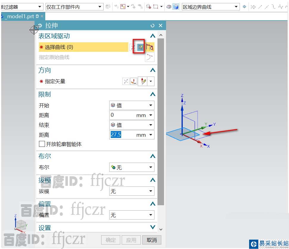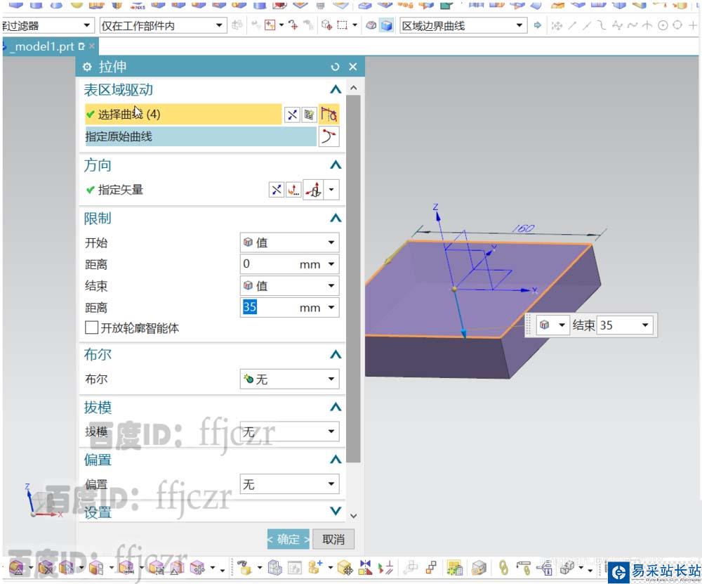 2、回到拉伸對話框,選擇拉伸方向為向下拉伸(這樣方便后面的草圖繪制)。拉伸的高度為35。得到模型的主體。