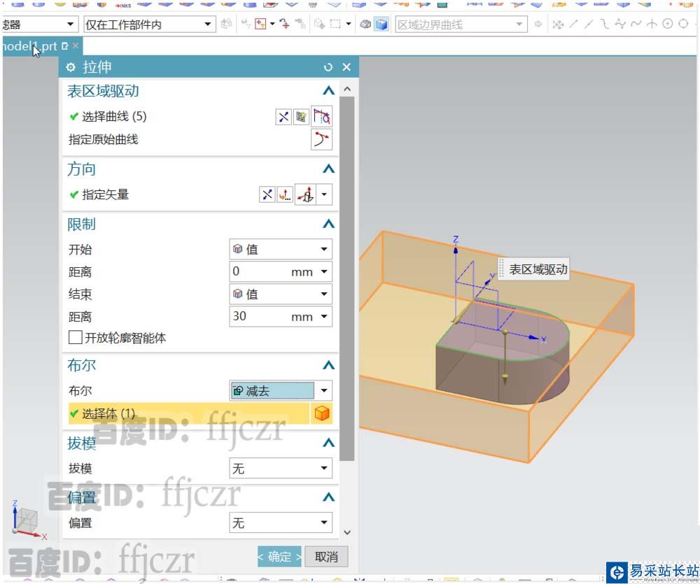 4、完成草圖,選擇向下拉伸30,并與主體進行布爾求差。得到模型凹槽直身結構。