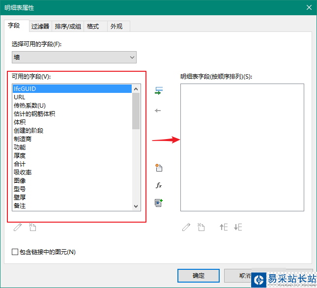 3、選擇需要的墻體參數信息,添加到右側字段;
