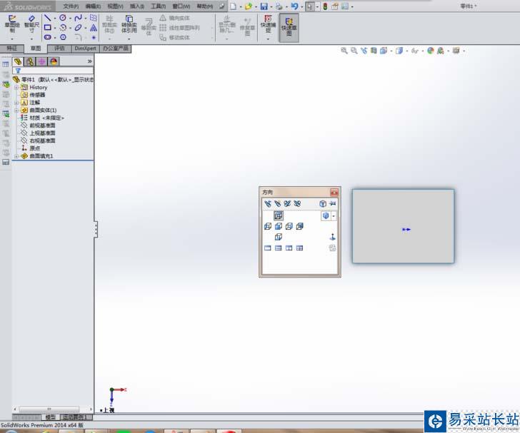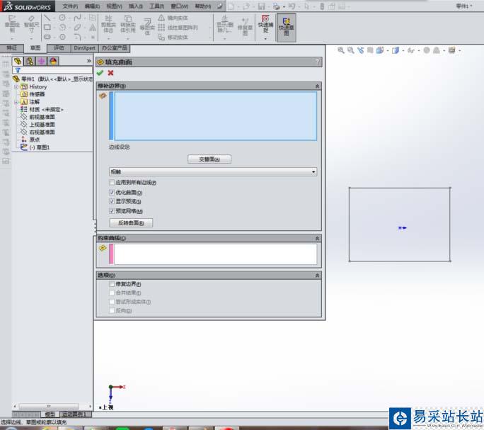 5、如下所示,進入“填充”對話框之后,就選擇矩形草圖,然后點擊左上角的√,完成曲面的填充,一個曲面就造好了。