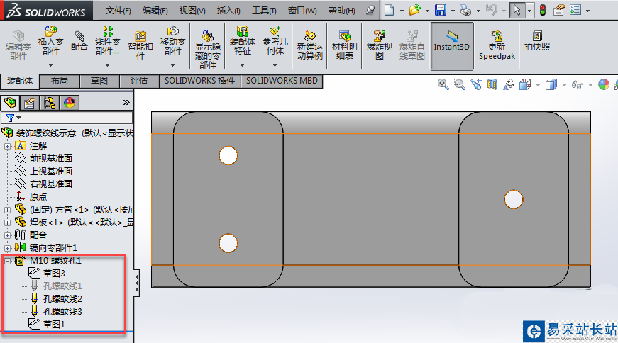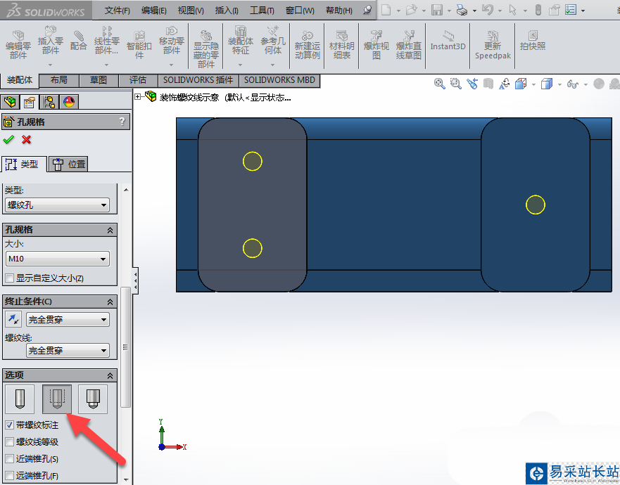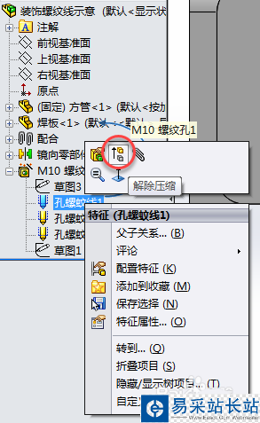1、出現這個問題時,首先應該打開裝配體對應的螺紋孔特征,確??滓幐窭镞x項一欄的“裝飾螺紋線”被選中,另外還要確認特征下面的裝飾螺紋線特征沒有被壓縮,如果被壓縮了的話需要點擊右鍵將其解除壓縮。