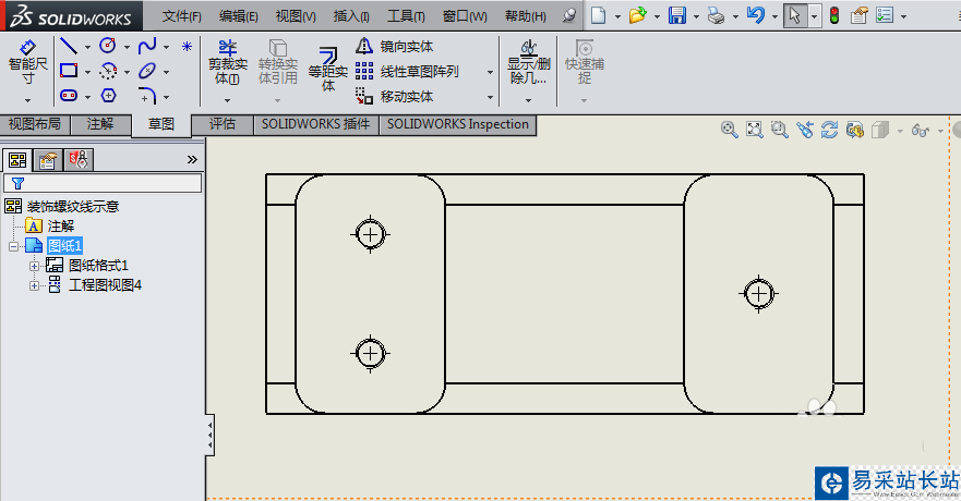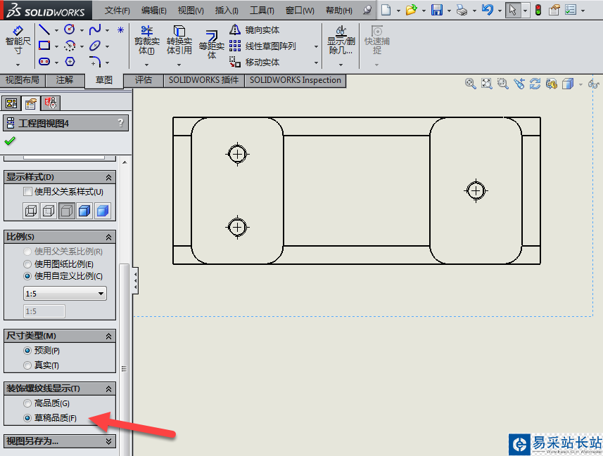 6、如果在“草稿品質”與“高品質”反復切換并插入模型項目4到5次后,裝飾螺紋線仍未出現的話,可能是軟件本身的顯示問題導致的;可以試試保存好工程圖文件后,關閉重啟solidworks再將該文件打開,看看裝飾螺紋線有沒有出現。