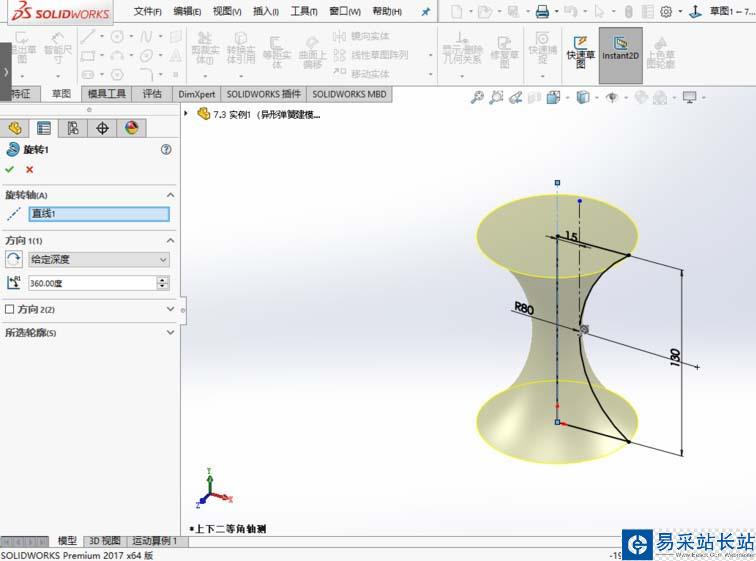 2、選定前視基準面,正視所選基準面,利用直線命令、圓弧命令進行繪草圖,并設定相關尺寸。采用旋轉凸臺特征命令,點擊確定。