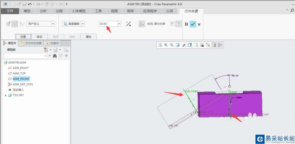 6、單擊”ASM_FRONT“和”FRONT“兩個基準面,將偏移角度設置為30度。