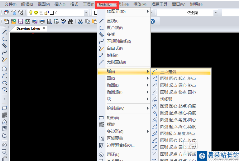 2、在軟件頁面正上方菜單欄中找到并點(diǎn)擊“繪制”選項(xiàng),在繪制的下拉欄中點(diǎn)擊弧這個(gè)選項(xiàng),這里選擇“三點(diǎn)定弧”。