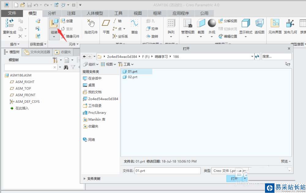 3、在“打開”對話框中找到選中要組裝的零件名稱(比如下圖中的"01.prt"),單擊“打開”。