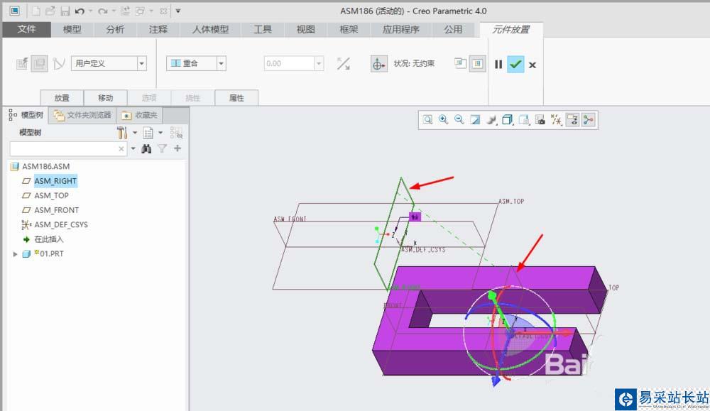 6、單擊”ASM_RIGHT“和”RIGHT“兩個基準面創建第一組約束。