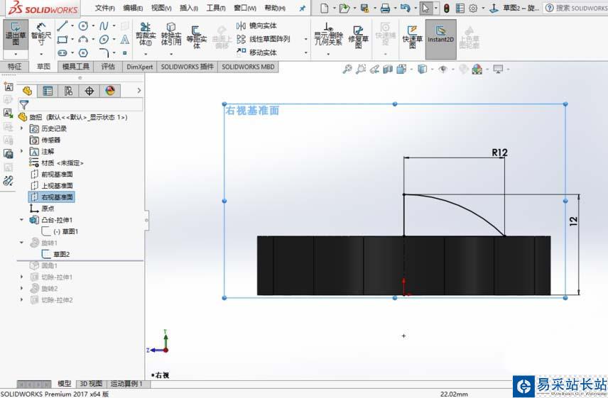 3、選定右視基準面,正視所選基準面,利用直線命令、圓弧命令進行繪草圖,并設定相關尺寸。采用旋轉凸臺特征命令,點擊確定。