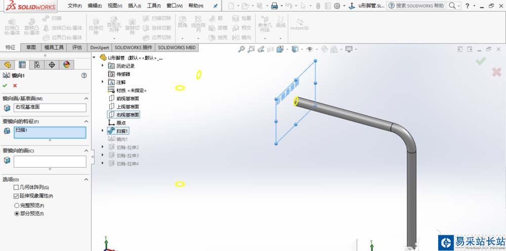 5、采用鏡像特征命令,選擇右視基準面為基準面,掃描特征1為鏡像特征,點擊確定。