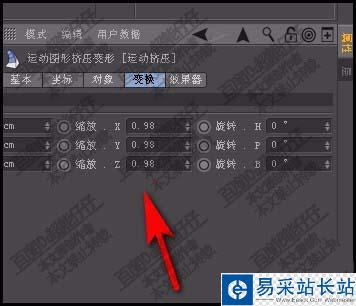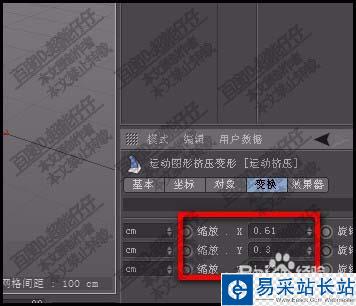 5、再看運(yùn)動(dòng)擠壓屬性面板。點(diǎn)開變換的屬性選項(xiàng)。在其縮放這一組中設(shè)置其參數(shù)。