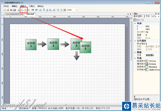3、在繪制流程圖的時候,若是同一個素材需要繪制多個時,可以在選中圖形后,點(diǎn)擊菜單欄上的“復(fù)制”按鈕,接著再點(diǎn)擊“粘貼”按鈕,即可成功復(fù)制素材。