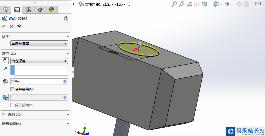 4、繪制草圖,拉伸凸臺,對錘子進一步裝飾。