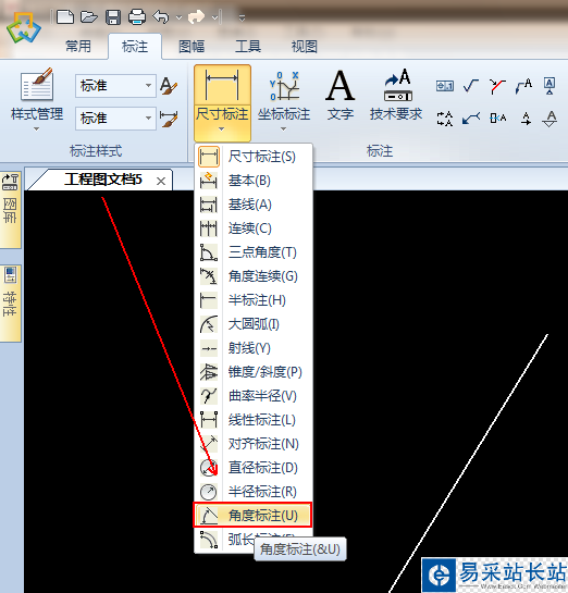 7、在彈出的菜單列表中單擊【角度標(biāo)注】選項。