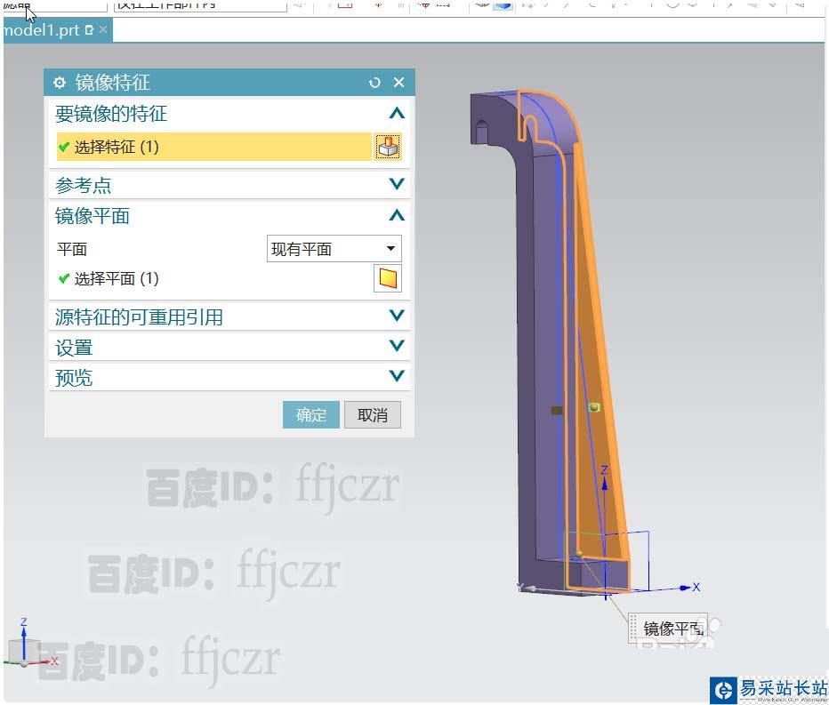 7、選用鏡像特征命令,特征對象為上步的加強(qiáng)筋,鏡像平面為XZ面。確定后得到加強(qiáng)筋的另一邊。模型創(chuàng)建完成。