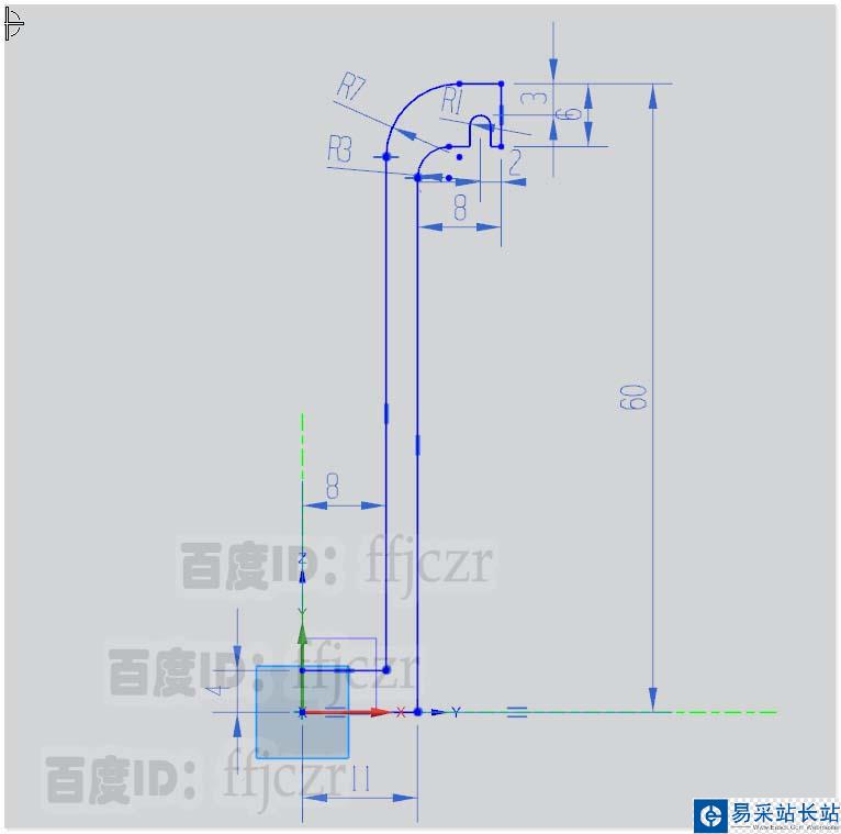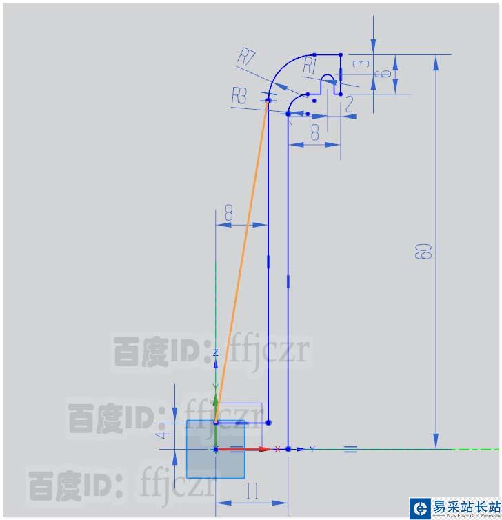 3、整個(gè)截面線的高度為60,這樣鉤狀模型的截面線就完成了;用直線從底座頂角與鉤狀外圓弧相切連接,得到加強(qiáng)筋的截面線。
