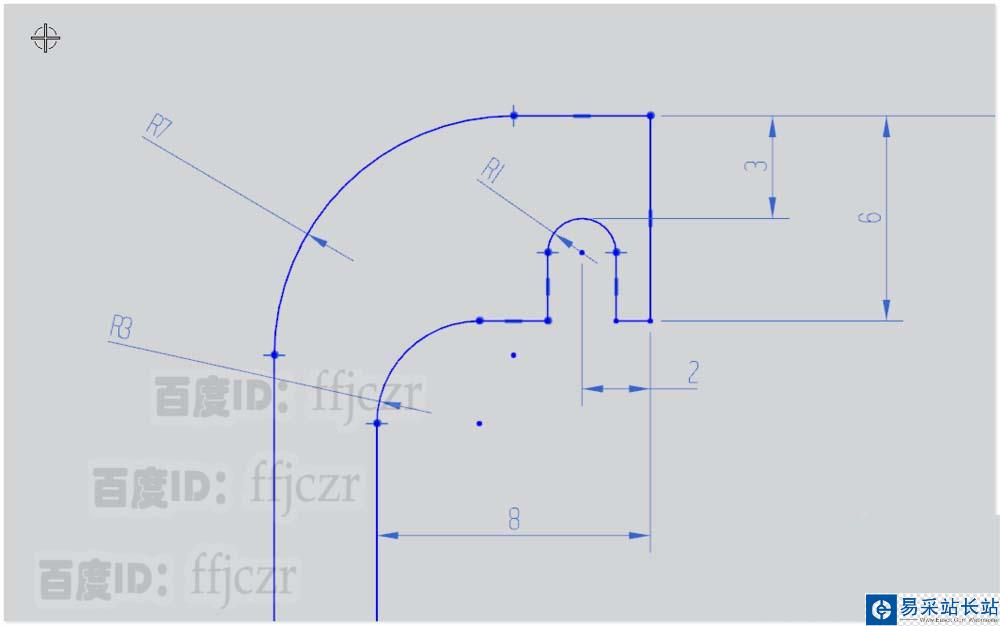 2、標(biāo)注尺寸對輪廓線進(jìn)行約束,底部為矩形狀,長為11寬為4;矩形與上臂連接桿厚度為3。上部為多圓弧連接,具體參數(shù)如圖所示。