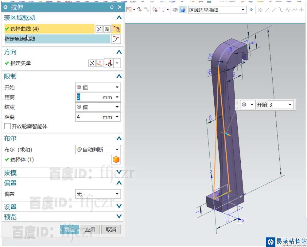 6、拉伸命令,選擇上步繪制的加強(qiáng)筋為截面線;開始值為3結(jié)束值為4,選擇與主體模型進(jìn)行布爾合并。得到一邊的加強(qiáng)筋。