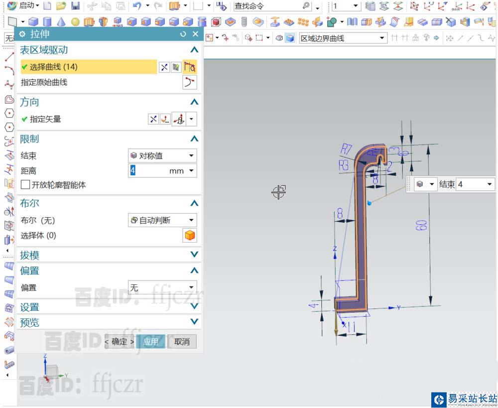 4、回到建模模式選用拉伸命令,截面線為上步繪出的鉤狀截面線;拉伸方式為對稱,距離為4。確定后得到模型的基本結(jié)構(gòu)。