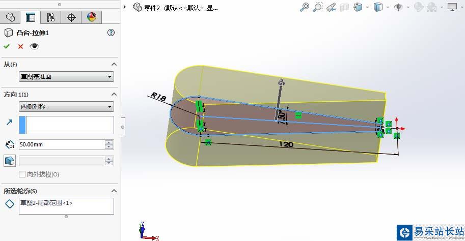 4、使用拉伸切除命令,注意這里選擇了反側(cè)切除,也是就僅僅保留草圖輪廓內(nèi)的實(shí)體。