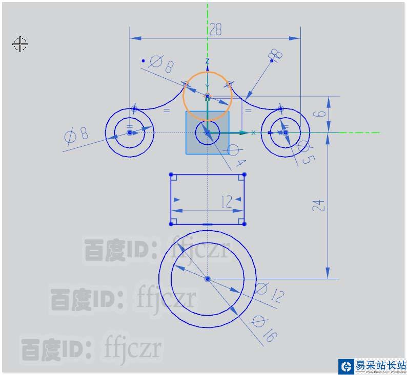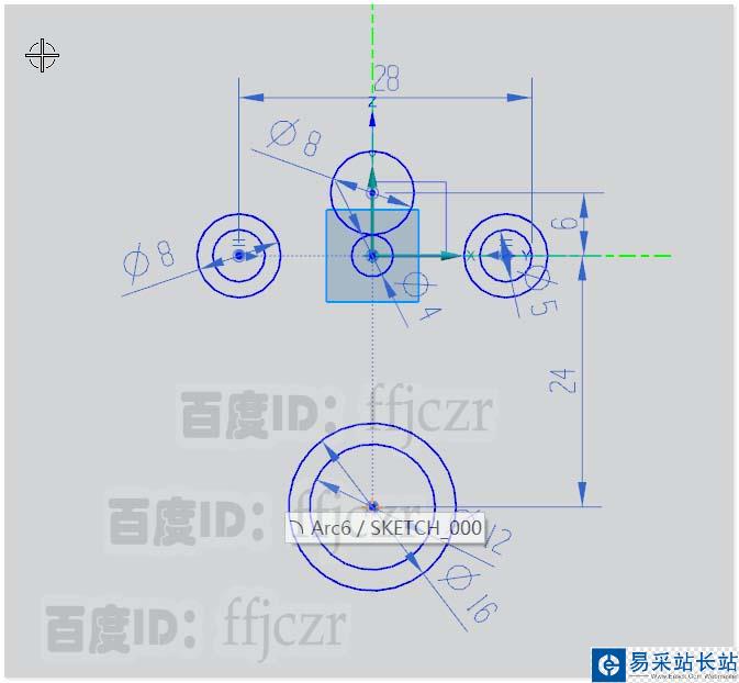 1、選用在任務環境繪制草圖,以YZ面為草繪平面。在坐標原點繪出一直徑為4的圓。在Y軸正方向上繪出直徑為8距離坐標原點為6的圓,在Y軸負方向距離原點為24處繪出二個同心圓直徑為12、16;在X軸正向上距離原點14處繪出二個同心圓直徑為5、8,并將這組同心圓鏡像到X軸負向上。