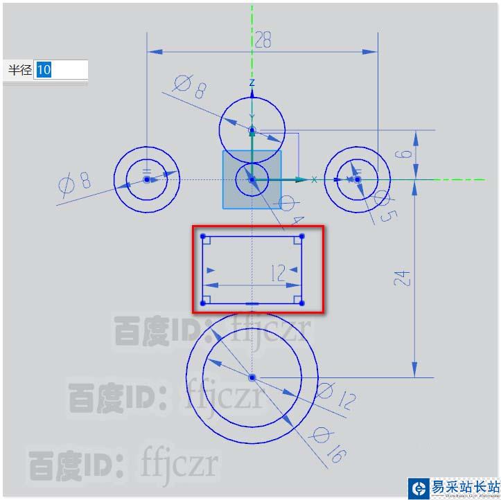 2、在Y軸負向上添加一個兩邊與Y軸對稱的矩形,長為12,寬度不用定,這矩形只是倒角用的參考。用倒圓角命令,將Y軸上的圓與X軸左右兩邊圓進行倒半徑為8的圓。用修剪命令將多余的線去掉。