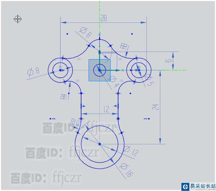 3、用倒圓角命令,將第2步創建的矩形與Y軸負向上直徑為16的圓進行倒半徑為10的圓;將矩形與X軸兩邊的圓進行半徑為4的倒圓。退出草繪模式,最終得到完整的截面線。