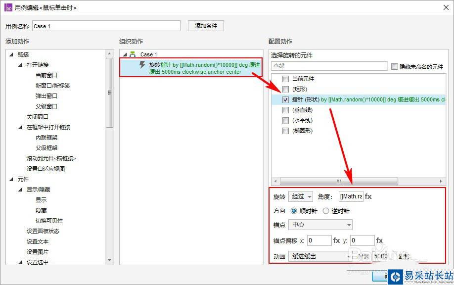 3、下面就是設置驅動指針轉動起來的交互效果,設置”按鍵:轉一轉“的”鼠標單擊時“的交互動作: