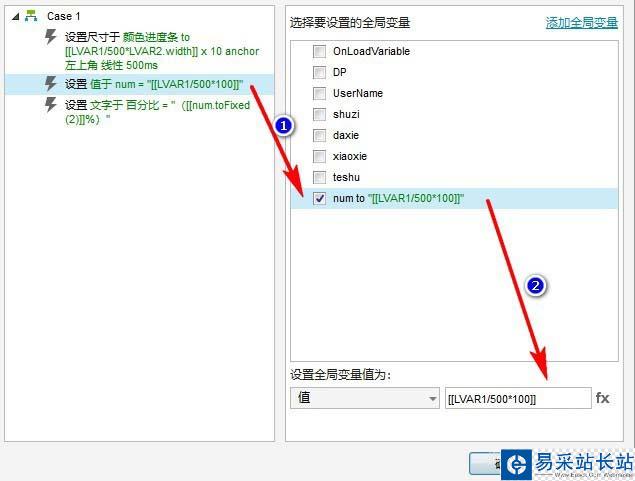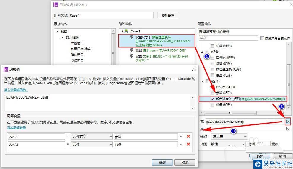 所以”矩形:顏色進(jìn)度條“的長度為:[[LVAR1/500*LVAR2.width]]