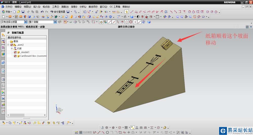1、我在UG中建模了一個紙箱子模型和一個帶有坡度的物體。裝配在一起來進行仿真。