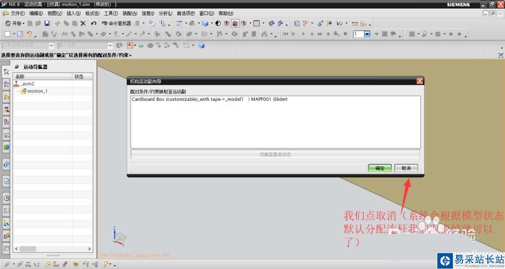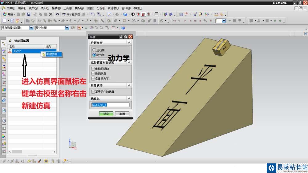 3、進入仿真界面--鼠標左鍵單擊模型文件名稱使之高亮顯示后-右鍵單擊新建仿真--動力學--確定(這里注意下,出現這個提示,我們選擇取消,這個系統會根據模型的狀態默認給你創建連桿,我們取消掉)